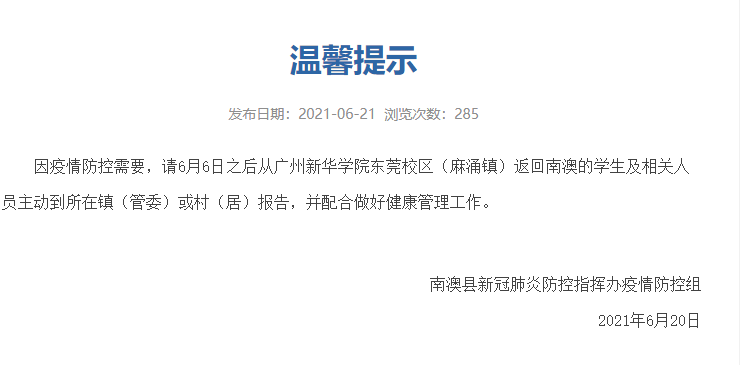 近日,南澳县新冠肺炎防控指挥办疫情防控组发布温馨提醒:因疫情防控需要,请6月6日之后从广州新华学院东莞校区(麻涌镇)返回南澳的学生及相关人员主动到所在镇(管委)或村(居)报告,并配合做好健康管理工作。