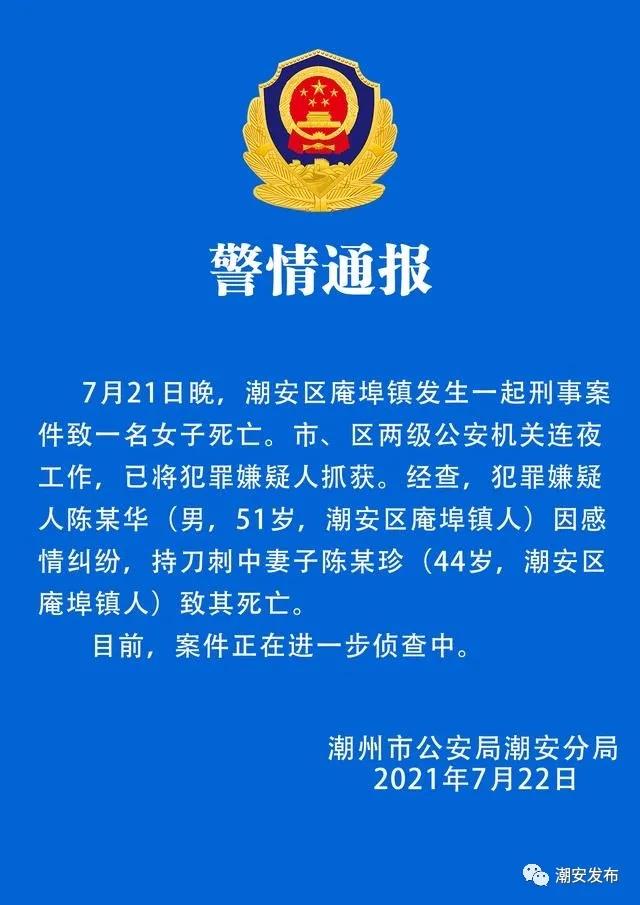 经查,犯罪嫌疑人陈某华(男,51岁,潮安区庵埠镇人)因感情纠纷,持刀刺中妻子陈某珍(44岁,潮安区庵埠镇人)致其死亡。目前,案件正在进一步侦查中。