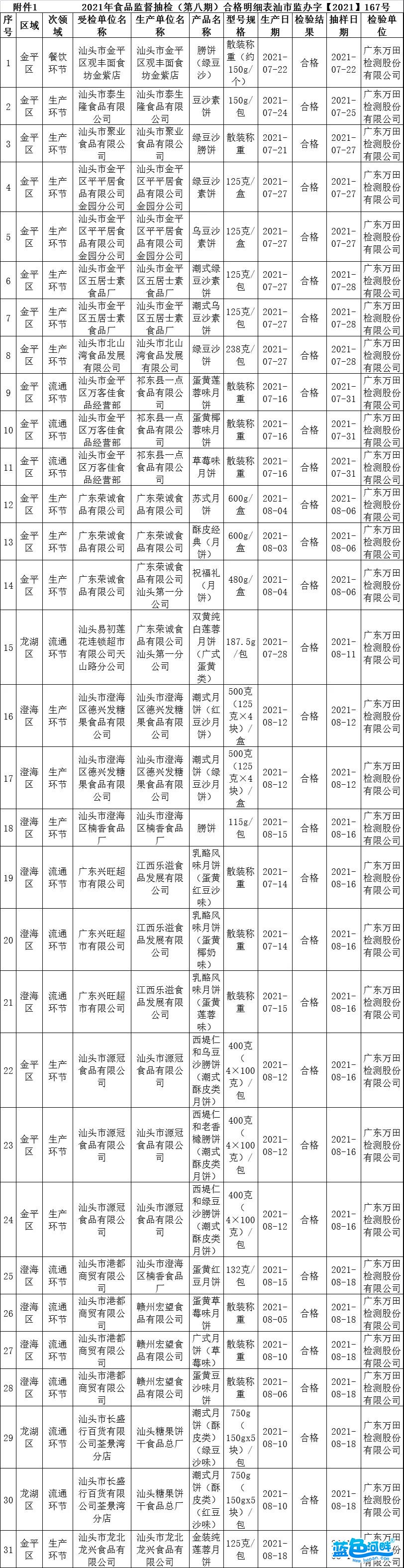 中秋佳节将至,为保障市场上月饼食品质量,市市场监督管理局组织对辖区内的食品生产、流通、餐饮服务环节生产经营的月饼进行专项监督抽样检验。 本次共抽样检验117批次,合格111批次,不合格6批次,合格率94.87%,因不合格产品尚在复检申请期限内,尚未公布名单。 本次抽检不合格项主要是“月饼”营养标签-钠项目不符合标准要求。《食品安全国家标准预包装食品营养标签通则》(GB 28050-2011)中规定,钠含量不得高于标签明示值的120%。钠元素不合格原因可能是原辅料质量控制不严,包括食品营养强化剂不满足质量规格要求、食品原料本底含量不清等;生产加工环节控制不严,包括生产加工过程中搅拌不均匀、企业未按标签明示值或企业标准的要求进行添加。 市场监管部门立即对抽检不合格食品依法实行下架、封存、召回等防控措施,并对生产、经营不合格食品单位依法进行调查、处理。 月饼做为中秋佳节的传统美食,象征着团团圆圆,而且现在的月饼种类也非常丰富,有传统的苏式月饼,广式月饼,还有年轻人喜欢的冰皮月饼等等,月饼作为中秋节的代表性食品也进入了销售和消费旺季。为使广大消费者吃的放心,吃的健康,汕头市市场监督管理局提醒月饼消费者注意以下事项: 一、通过正规渠道购买月饼,并留存购物凭证。购买时注意查看包装是否完整,盛放容器是否清洁(特别是散装月饼)。查看其标签是否包含食品名称、配料表、净含量和规格、生产者和(或)经销者的名称、地址和联系方式、生产日期和保质期、贮存条件、食品生产许可证编号、产品标准代号等方面内容。不要购买或食用无标签或标签信息不全、内容不清晰,掩盖、补印或篡改标示的产品。 二、购买后按照包装标签标示的方法贮存。选择温度、湿度等适宜的贮存环境,尽量不要与其他食品、杂物一起存放。 三、不同类别月饼糖分、油脂等含量不同,消费者可根据个人喜好选购。选购时,还要注意食品的营养标签,消费者可根据营养素参考值和自己的身体状况选择食用。此外,多数月饼中的能量、脂肪和碳水化合物较高,不宜过量食用,否则容易引起肠胃不适,特别是老人、儿童、肠胃功能弱者。 四、配料顺序有讲究,致敏信息勿漏读。按照相关国家标准要求,食品中使用的所有食品添加剂都必须在配料表中注明,并按制造或加工食品时的加入量,依从高到低顺序逐一排列,加入量不超过2%的配料可不按照递减顺序排列。食品添加剂的使用种类和添加量均应严格按照国家标准添加。配料中若含有可能导致过敏反应的食品及其制品,如含有麸质的谷物及其制品、花生及其制品等,厂家可以(不是必须)在配料表中使用易辨识的名称,或在配料表邻近位置加以提示。易敏人群在挑选或食用月饼时需注意仔细查阅配料表,以及配料表邻近位置是否有提示信息。 五、食用月饼前要注意卫生。洗净双手,注意观察月饼外观是否正常,有无异味、霉变等现象,一旦发现异常,应停止食用。 |