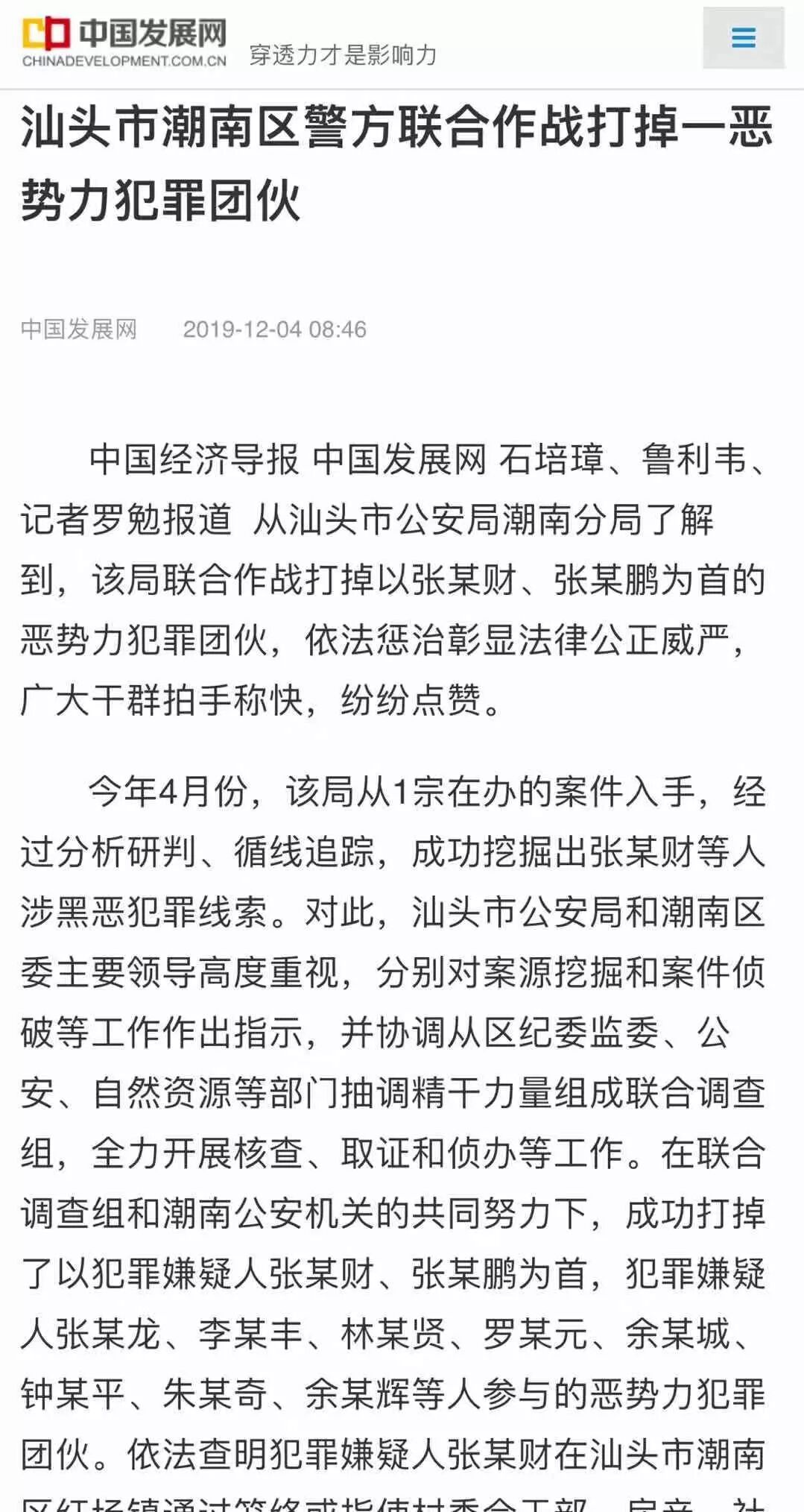 |   为营造扫黑除恶的强大宣传舆论攻势,展现潮南公安机关开展扫黑除恶专项斗争特别是“村霸”等黑恶势力问题专项整治成效,提高扫黑除恶群众知晓率和安全感,12月3日下午,潮南公安机关召开扫黑除恶专项斗争新闻通报会。     市局刑警支队副支队长、市局扫黑办副主任林少辉,区政法委副书记、区扫黑办副主任江汉心,市局宣传科、市局扫黑办相关领导同志出席通报会,分局党委副书记、副局长张东生,分局各单位主要领导,分局扫黑办、攻坚队相关领导及专案民警,中央、省、市、区四级主流新闻媒体记者参加了通报会。通报会由林少辉同志主持。     通报会前,参会媒体集体参观潮南区公安机关扫黑除恶专项斗争阶段成果展。  张东生同志通报分局阶段来侦办的典型案例,介绍专项斗争及重点地区打击整治的有关成效。 专项斗争开展以来,潮南公安机关在上级政法公安机关和区委区政府的坚强领导下,在各职能部门、各镇(街道)支持配合下,按照扫黑、除恶、治乱工作思路,举全警之力、集全警之智,用足法律,依法严惩涉黑涉恶等违法犯罪活动,推动扫黑除恶专项斗争向纵深开展,先后打掉黑社会组织2个,恶势力犯罪集团4个,恶势力犯罪团伙50个,查破涉黑涉恶案件430宗,抓获涉黑恶犯罪嫌疑人883名,查封、冻结、扣押涉案资产1亿多元。      通报会后,各级主流媒体相继报道我区扫黑除恶专项斗争整治成效。  下来,潮南警队一定牢记使命、砥砺前行,认真总结经验,在巩固好专项整治成效的同时,坚持频道不换、力度不降、措施不减,全力推进好扫黑除恶专项斗争收官年各项工作,维护好社会公平正义,营造好共建共治共享社会治理新格局。 -END- 图/林勰 编辑/林茵 审核/赵资宏 叶旭斌   潮南公安 不忘初心 牢记使命 搜索关注“潮南公安”订阅号 或长按左边二维码 感谢您的关注 |