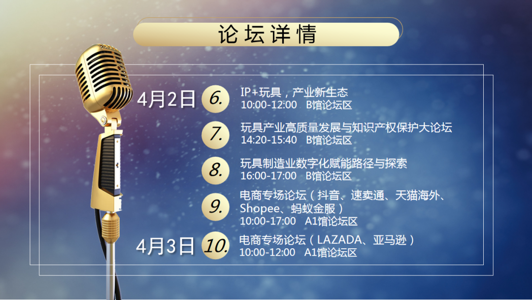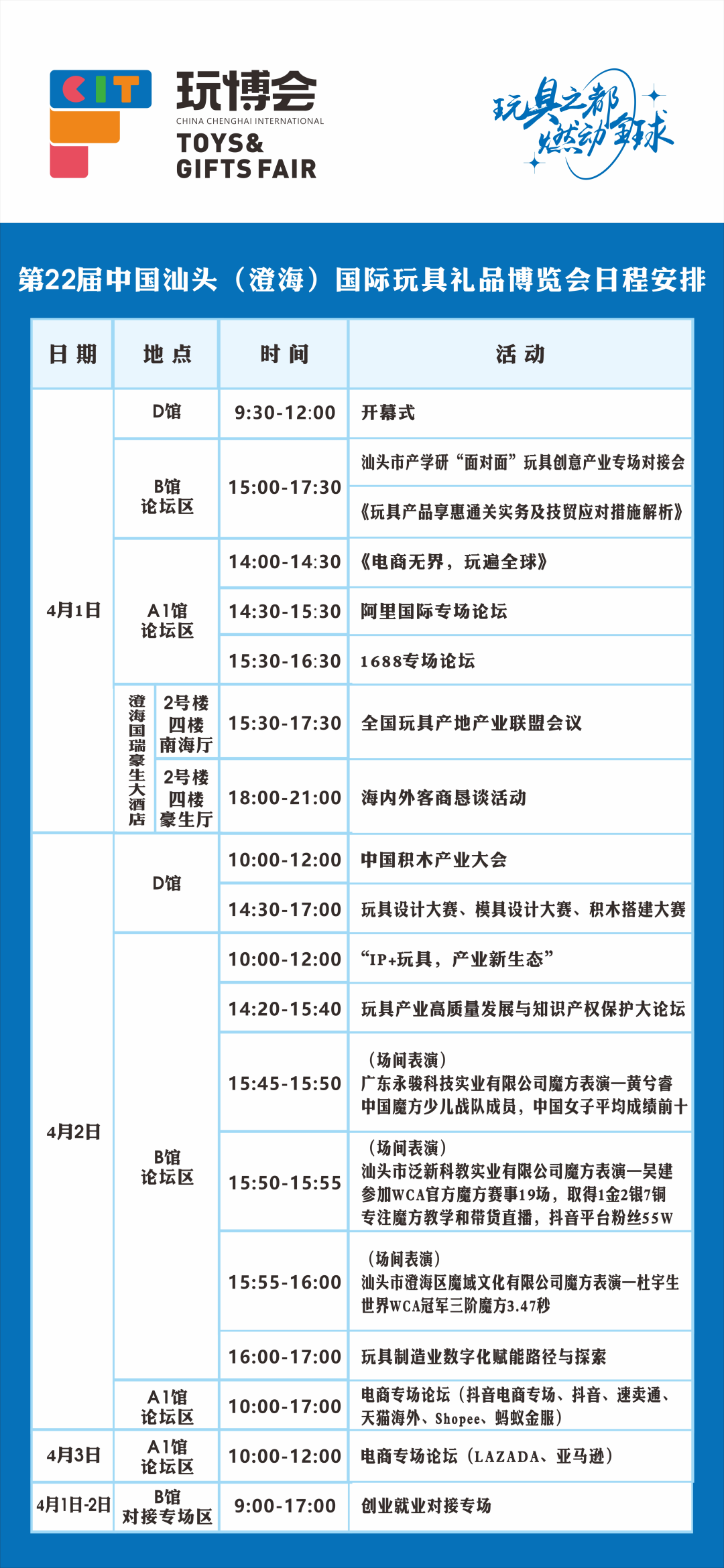 第22届汕头玩博会由汕头市人民政府、澄海区人民政府指导,中国国际商会、中国轻工工艺品进出口商会、中国玩具和婴童用品协会、汕头市澄海区玩具协会联合主办,以“玩具之都,燃动全球”为主题,定于2023年4月1日至3日在汕头博览中心举行。 第22届中国汕头(澄海)国际玩具礼品博览会2023年4月1日 盛大开幕!请务必携带身份证扫描登记换证二维码观展采购 video: https://mp.weixin.qq.com/mp/readtemplate?t=pages/video_player_tmpl&action=mpvideo&auto=0&vid=wxv_2843138520658526209 三展同期 场地升级 本届同期举办第22届中国汕头(澄海)国际玩具礼品博览会、第5届澄海玩具机械展和首届IP创意授权及衍生品展三个主题展会,串联玩具行业上下游全产业链,从产品、设备到研发设计“一条龙”服务到位。展馆面积达到5万平方米,分为A、B、C、D、E五大展馆,分设玩具品牌馆、电商馆、IP馆、综合馆和澄海玩具和工艺美术发展史馆等主题展馆。本次参展的企业达到460家,其中本地展商占比74%,外地展商占比26%,星辉、实丰、菠萝树、优酷、阿里鱼、东芝等知名品牌均报名参展。 参展品类涵盖正版授权玩具、模型玩具、益智科教、婴幼童玩具、遥控玩具、电动玩具、塑胶玩具、拼插玩具、DIY玩具、纸板类玩具、娃娃、布毛绒玩具、音乐玩具、体育玩具、户外及运动用品、节日、派对用品、IP授权、设计服务、设备原料、包装配件、电商平台、跨境电商等。 开幕盛典 精彩纷呈 线上线下 随时下单 此次组委会加码打造为期15天的线上云展会,众多参展商线上线下齐聚一堂,通过线上展厅、直播互动展示营销,真正有效地帮助参展商突破边界重构商机。采购商通过注册、线上选样、提交询价等高效便捷地满足采购需求,真正全面落实线上线下供需对接,打造永不落幕的“汕头玩博会”。 两会齐发 引领行业 4月1日举办全国玩具产地产业联盟会议,各地兄弟协会、玩具“大佬”应邀前来共商行业发展大计。在会上将共同签署并发布《玩具产业高质量发展——汕头宣言》,凝聚行业专家的智慧,团结玩具行业基层力量,推动实现玩具产业高质量发展,共同铸就“玩具生产强国”的繁荣兴盛。 4月2日举办首届中国积木产业大会,开创行业先锋,汇聚专家大咖,以全球化、前瞻性的视角,洞察、解析、对话、研讨,为近年发展势头强劲的国产积木产业搭建开放创新、协作共赢的交流与合作平台,把中国积木推广到海外,向全球市场展示积木界的中式美学和中国创造。 十大论坛 聚焦发展 特邀多位重量级专家大咖现场分享最新发展趋势,产学研对接专场、创业就业对接专场、《IP+玩具产业新生态》、《玩具产品享惠通关实务及技贸应对措施解析》、阿里国际、1688、抖音电商、速卖通、天猫海外、Shopee、蚂蚁金服、LAZADA、亚马逊等多场推介会聚焦行业热门话题,碰撞思想火花。 百佳企业 行业榜样 澄海玩具产业从无到有、从小到大、从弱到强,广大刻苦创业的玩具供应商和玩具采购商功不可没。本次玩博会经公开选拨,评选出百家“优秀玩具采购商”、“优秀玩具供应商”,表彰他们对行业发展作出的杰出贡献,给予行业最有力肯定,为行业树立优秀榜样和形象地位。在海内外客商恳谈活动上将举行授牌仪式,多位重量级嘉宾、来自全国各地的兄弟协会、以及澄海玩具行业代表等将共同见证这一重大时刻。 客商云集 彰显魅力 为切实保障展会效果,让参展商能实实在在拿到订单,本次组委会着重规划招商工作,不仅委派专人到欧洲、亚洲、美洲和澳洲拜访邀请客户,在香港、汕头、义乌、深圳等地召开多场招商推介会议,还派出招采小组开启全国巡回地推工作,走访广州、佛山、东莞、长沙、南宁、昆明、重庆、成都、临沂、北京等共计36个玩具专业批发市场,在玩博会线上买家邀约登记系统登记的客商人数已超过8000人。展会三天将有超9000+国内外专业买家和100+头部跨境电商,来自美国、德国、俄罗斯、白俄罗斯、阿根廷、法国、加拿大、韩国、新加坡、印尼、马来西亚、乌克兰、哈萨克斯坦、印度、埃及、沙特、土耳其、约旦、巴基斯坦、伊朗、孟加拉、摩洛哥等多国客商都将齐聚玩博会,其中不乏大牌采购商像全球最大的玩具连锁店玩具反斗城和国际知名母婴用品连锁店babyshop买手团队、孩子王、名创优品、阿里集团及抖音等国内知名采购商及平台,展会专业观众人数可达到4—5万人。通过玩博会这个国际平台,“澄海玩具卖全球”的愿景蓝图正一步步变成现实美景。 三大赛事 创新赋能 汕头市玩具设计大赛 为发掘和表彰全球范围内卓越优秀的玩具设计和创意,激励设计师、机构以及品牌创造出更多优质的产品、项目和服务,激发玩具行业创造活力,不断提升我市玩具行业的设计研发水平,在玩博会举办期间,汕头市澄海区总工会、汕头市澄海玩具协会联合举办汕头市玩具设计赛。比赛分为产品组和概念组,获奖作品将在特设的作品展区域展出,并与当地企业开展产业对接活动,合力促进玩具设计成果转化和产业化应用。 模具虚拟装配大赛 为激发高职院校学生对于模具技能学习的兴趣,引导学习模具行业现代技术,促进模具设计与制造专业基于模具生产工作全过程导向的教学改革,加快模具行业高技能人才的培养,为区域经济发展培养高素质的技术技能型人才,汕头市澄海区总工会、汕头市澄