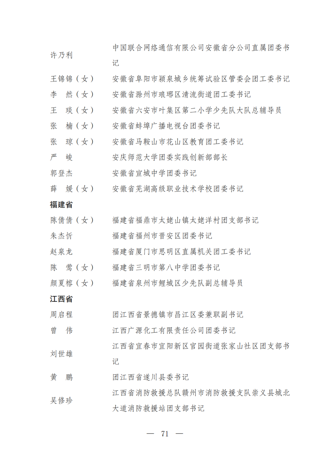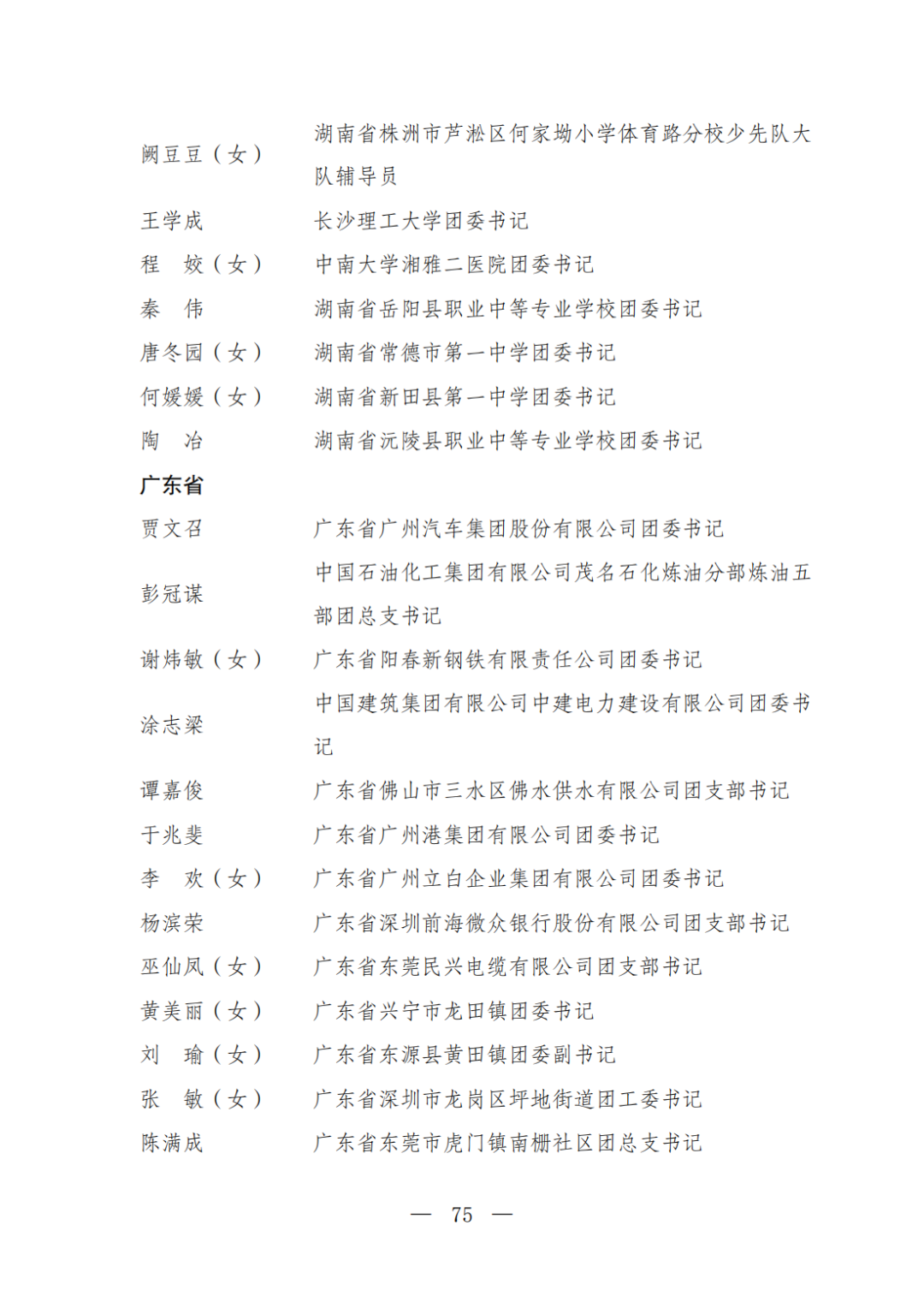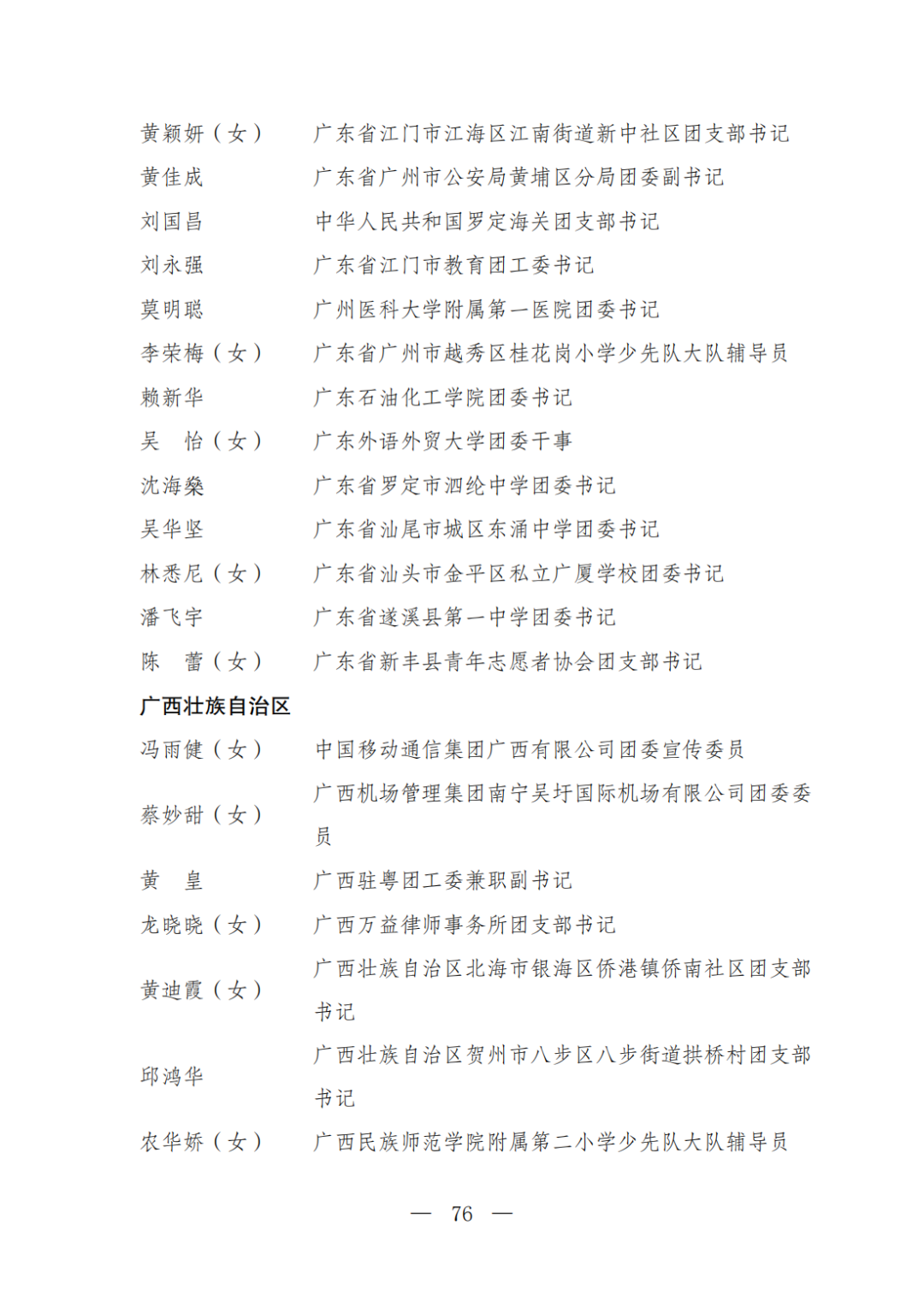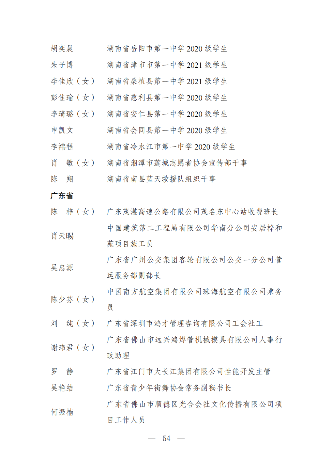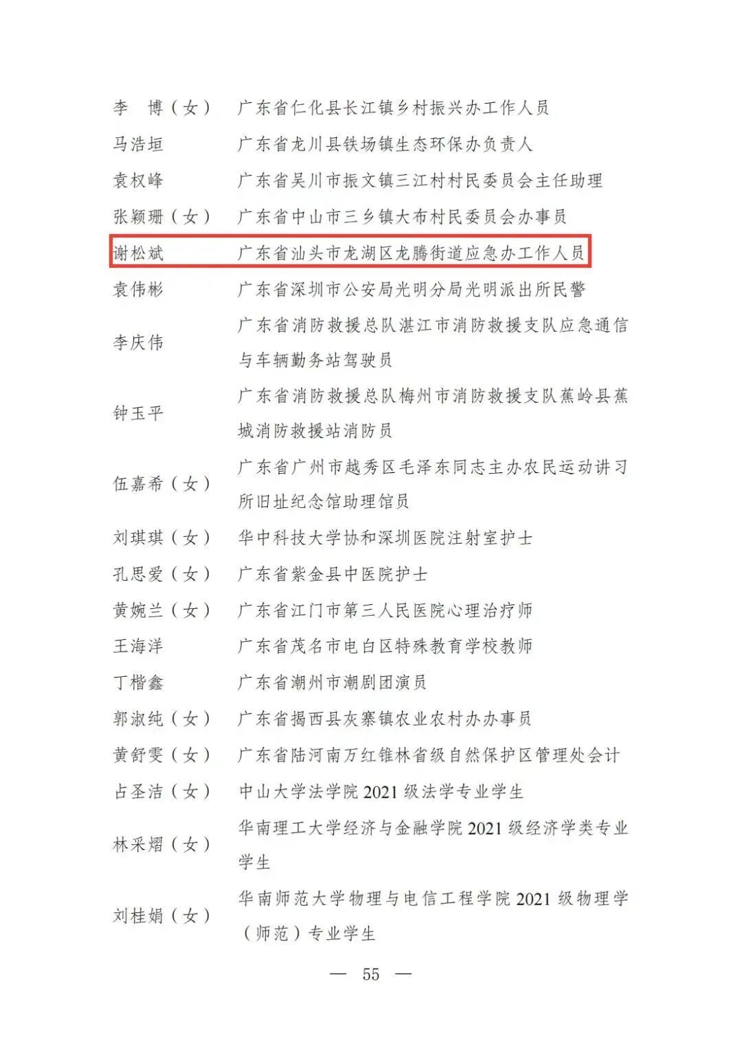 | 透过视窗,了解龙湖 全国五四红旗团委(团支部)、全国优秀共青团员、全国优秀共青团干部是共青团中央设立的分别授予县级以下团委和基层团组织、团员、团干部的团内最高荣誉。为充分发挥先进典型示范引领作用,激励广大团组织和团员、团干部踔厉奋发、创先争优,共青团中央决定,在五四青年节前表彰一批先进团组织和团员、团干部。 经基层团组织推荐、省级团委考察初审、共青团中央复审,提出685个团组织、482名(含追授1名)团员、342名共青团干部的拟表彰名单。现予以公示,公示时间为2023年4月7日至4月13日。公示期间,如对拟表彰对象持有异议,可通过电话、传真、电子邮件、信函等形式反映情况,信函以到达日邮戳为准。反映情况要客观真实,以个人名义反映情况的材料应提供实名及联系方式,以单位名义反映情况的材料需加盖单位公章。 电话:(010)85212088 传真:(010)85212187 电子邮箱:tzytyglc@gqt.org.cn 通信地址:北京市东城区前门东大街10号共青团中央基层建设部 邮政编码:100005 龙湖区有1名个人入围公示:广东省汕头市龙湖区龙腾街道应急办工作人员谢松斌入选全国优秀共青团员名单。 全国优秀共青团员 广东省汕头市龙湖区 龙腾街道应急办工作人员谢松斌 以下是全部名单公示: 全国五四红旗团委名单(共296个) (左右滑动图片可见全部名单) 全国五四红旗团支部名单 (共389个) (左右滑动图片可见全部名单) 全国优秀共青团员名单 (共482人) (左右滑动图片可见全部名单) 全国优秀共青团干部名单 (共342人) (左右滑动图片可见全部名单) 信息来源 | 龙湖青年 投稿请发 | 龙湖区融媒体中心 邮箱 | stlhxxg@126.com 龙湖视窗 汕头市龙湖区政府官方发布平台 ● 微信号 : st-longhu ● ●透过龙湖视窗 看升腾中的龙湖 ● |