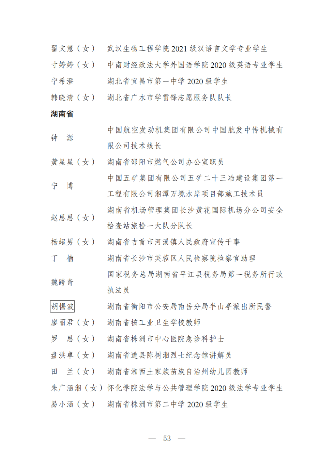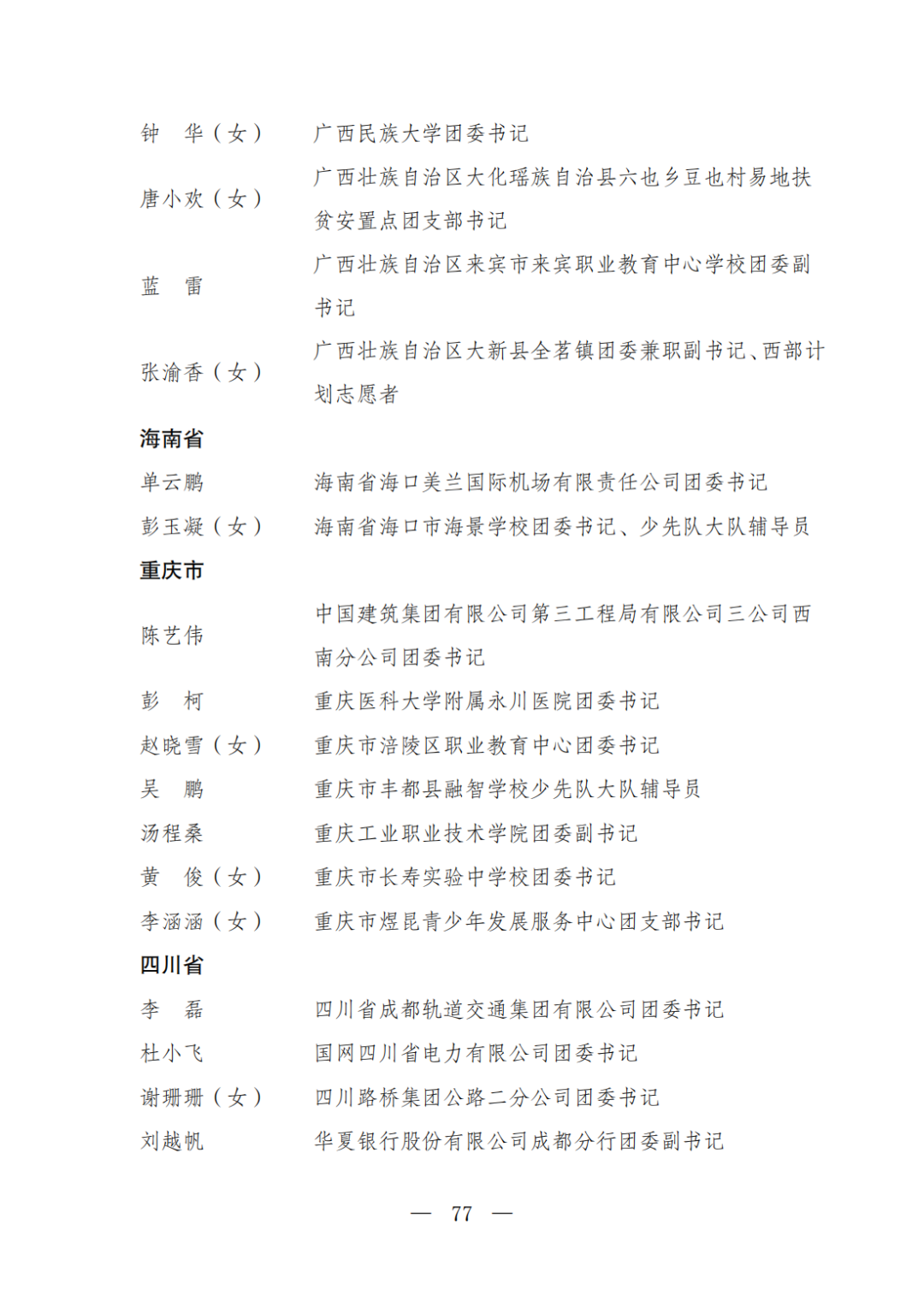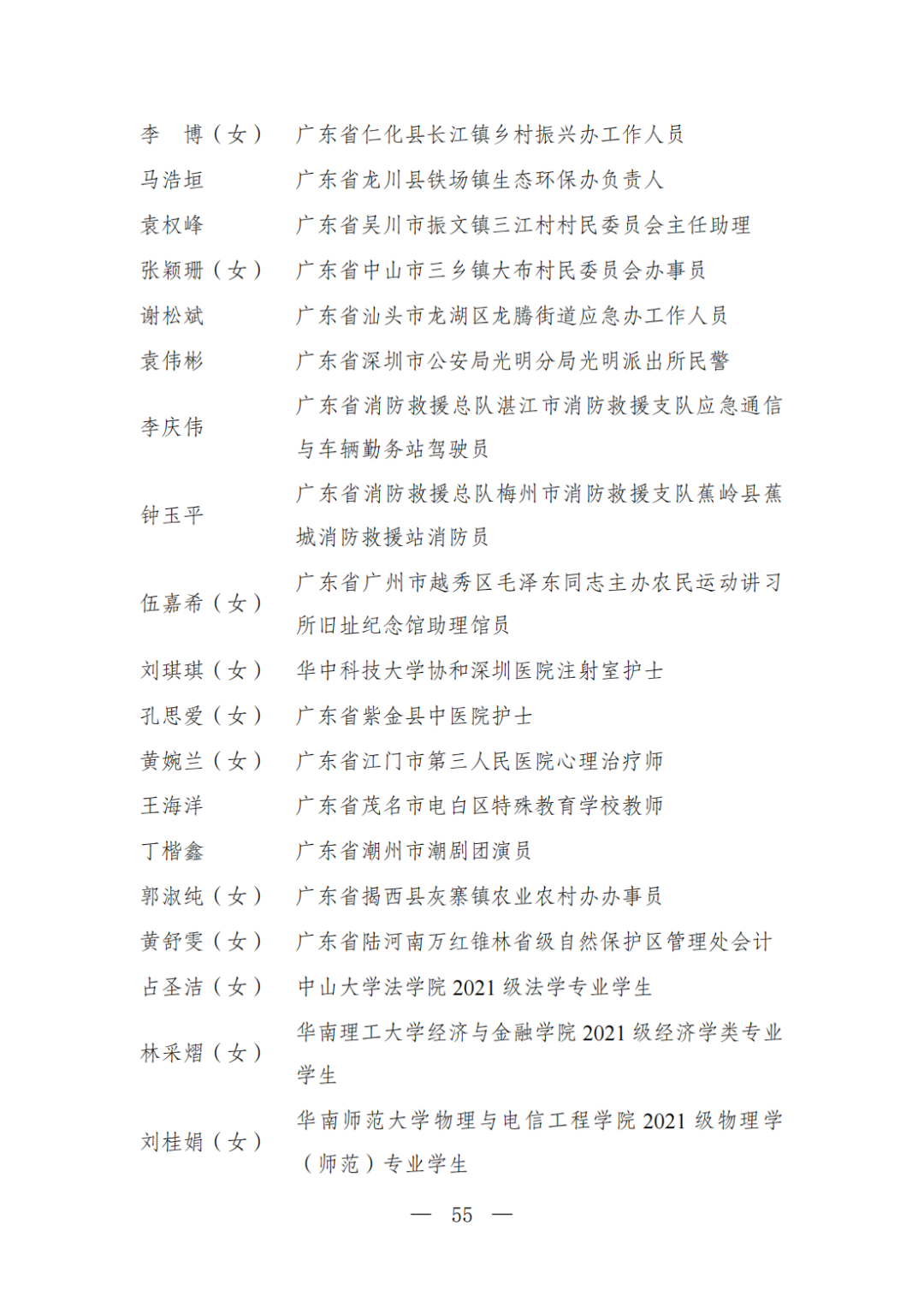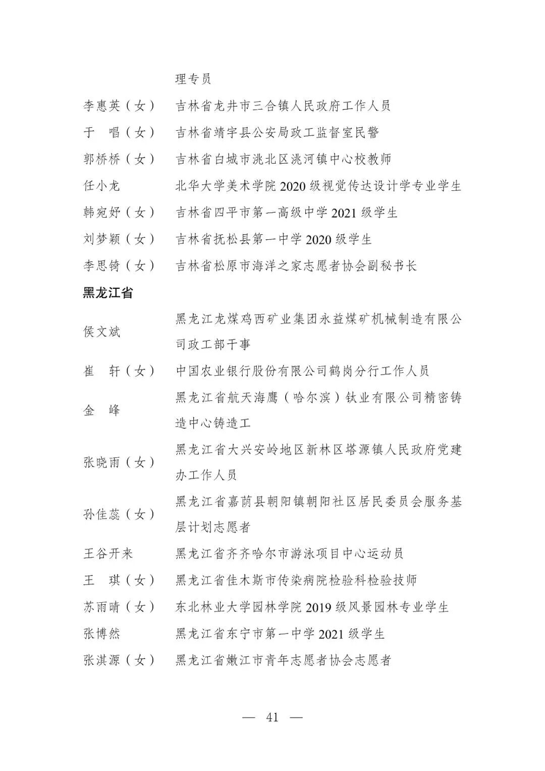 | 透过视窗,了解龙湖 全国五四红旗团委(团支部)、全国优秀共青团员、全国优秀共青团干部是共青团中央设立的分别授予县级以下团委和基层团组织、团员、团干部的团内最高荣誉。为充分发挥先进典型示范引领作用,激励广大团组织和团员、团干部踔厉奋发、创先争优,共青团中央决定,在五四青年节前表彰一批先进团组织和团员、团干部。 经基层团组织推荐、省级团委考察初审、共青团中央复审,提出685个团组织、482名(含追授1名)团员、342名共青团干部的拟表彰名单。现予以公示,公示时间为2023年4月7日至4月13日。公示期间,如对拟表彰对象持有异议,可通过电话、传真、电子邮件、信函等形式反映情况,信函以到达日邮戳为准。反映情况要客观真实,以个人名义反映情况的材料应提供实名及联系方式,以单位名义反映情况的材料需加盖单位公章。 电话:(010)85212088 传真:(010)85212187 电子邮箱:tzytyglc@gqt.org.cn 通信地址:北京市东城区前门东大街10号共青团中央基层建设部 邮政编码:100005 龙湖区有1名个人入围公示:广东省汕头市龙湖区龙腾街道应急办工作人员谢松斌入选全国优秀共青团员名单。 全国优秀共青团员 广东省汕头市龙湖区 龙腾街道应急办工作人员谢松斌 以下是全部名单公示: 全国五四红旗团委名单(共296个) (左右滑动图片可见全部名单) 全国五四红旗团支部名单 (共389个) (左右滑动图片可见全部名单) 全国优秀共青团员名单 (共482人) (左右滑动图片可见全部名单) 全国优秀共青团干部名单 (共342人) (左右滑动图片可见全部名单) 信息来源 | 龙湖青年 投稿请发 | 龙湖区融媒体中心 邮箱 | stlhxxg@126.com 龙湖视窗 汕头市龙湖区政府官方发布平台 ● 微信号 : st-longhu ● ●透过龙湖视窗 看升腾中的龙湖 ● |