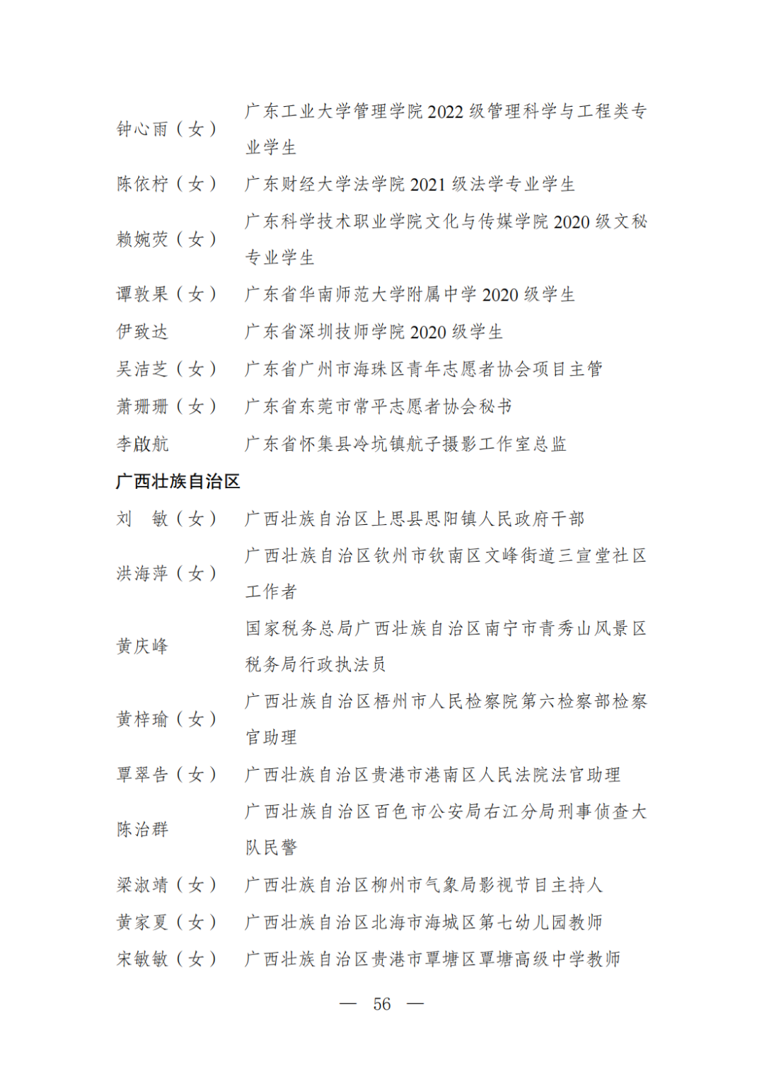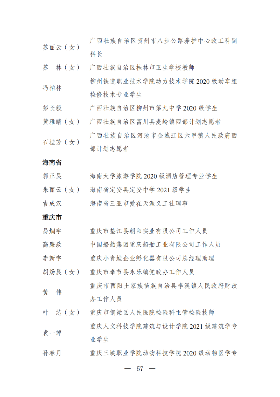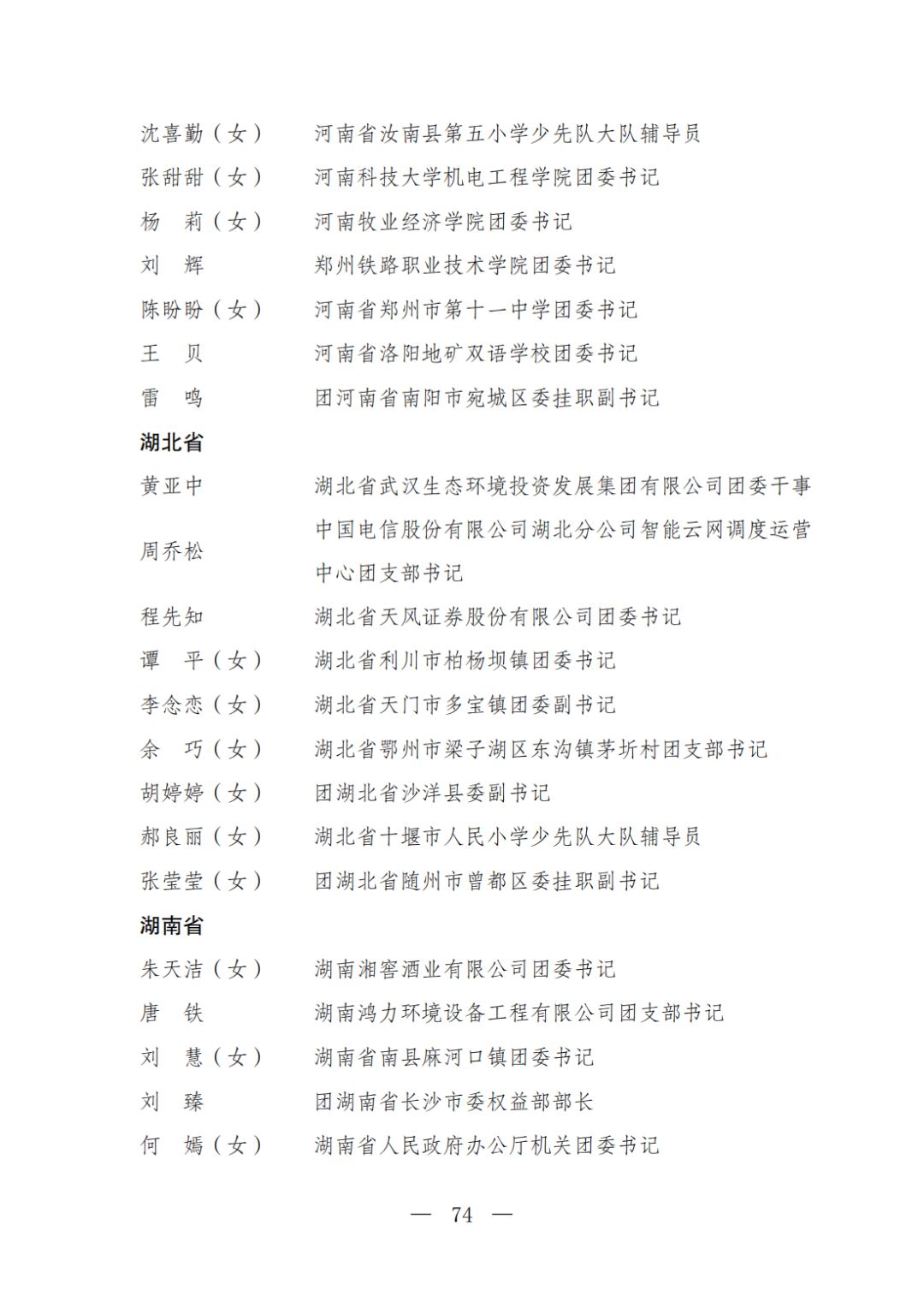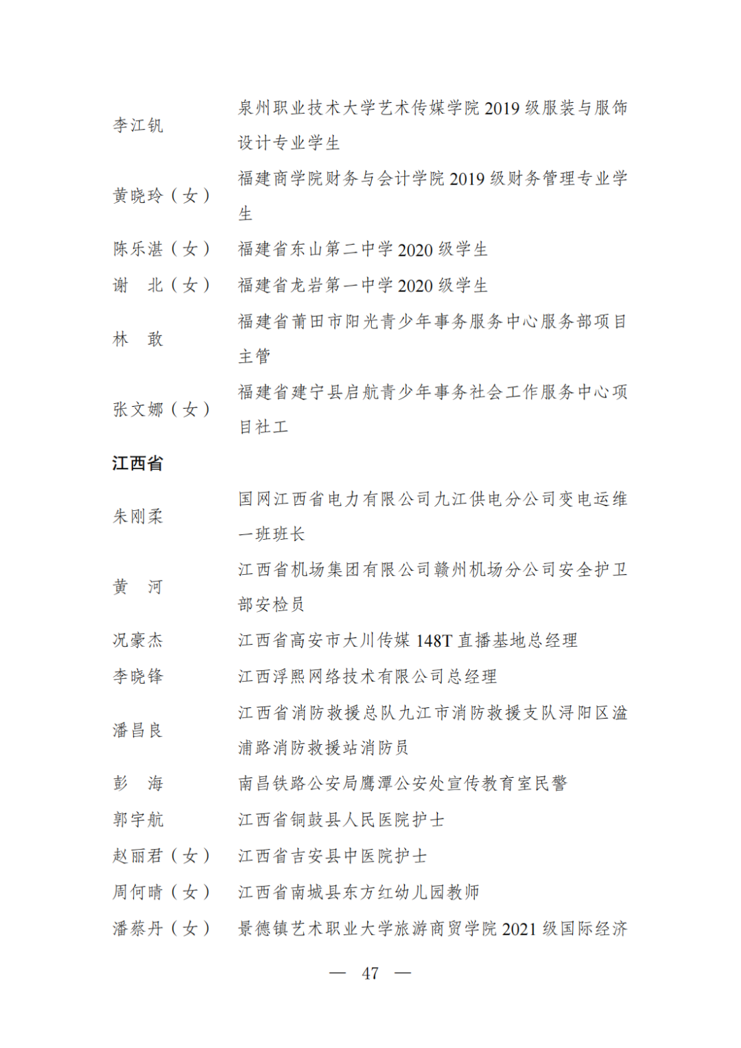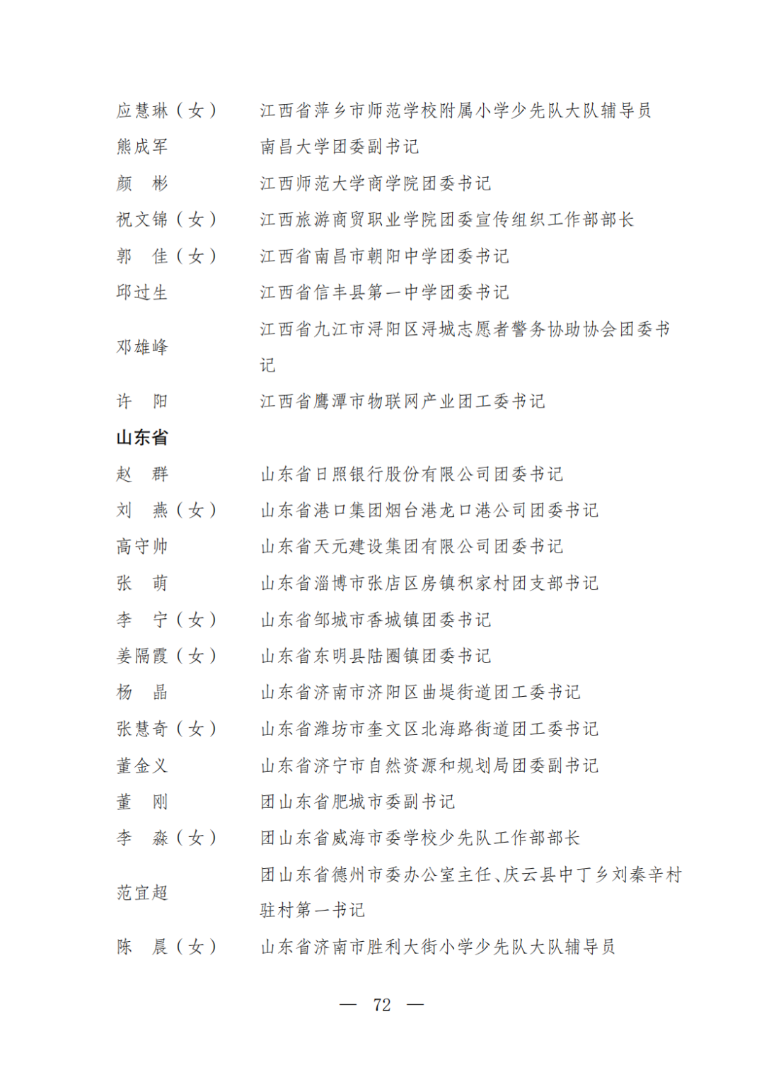 | 透过视窗,了解龙湖 全国五四红旗团委(团支部)、全国优秀共青团员、全国优秀共青团干部是共青团中央设立的分别授予县级以下团委和基层团组织、团员、团干部的团内最高荣誉。为充分发挥先进典型示范引领作用,激励广大团组织和团员、团干部踔厉奋发、创先争优,共青团中央决定,在五四青年节前表彰一批先进团组织和团员、团干部。 经基层团组织推荐、省级团委考察初审、共青团中央复审,提出685个团组织、482名(含追授1名)团员、342名共青团干部的拟表彰名单。现予以公示,公示时间为2023年4月7日至4月13日。公示期间,如对拟表彰对象持有异议,可通过电话、传真、电子邮件、信函等形式反映情况,信函以到达日邮戳为准。反映情况要客观真实,以个人名义反映情况的材料应提供实名及联系方式,以单位名义反映情况的材料需加盖单位公章。 电话:(010)85212088 传真:(010)85212187 电子邮箱:tzytyglc@gqt.org.cn 通信地址:北京市东城区前门东大街10号共青团中央基层建设部 邮政编码:100005 龙湖区有1名个人入围公示:广东省汕头市龙湖区龙腾街道应急办工作人员谢松斌入选全国优秀共青团员名单。 全国优秀共青团员 广东省汕头市龙湖区 龙腾街道应急办工作人员谢松斌 以下是全部名单公示: 全国五四红旗团委名单(共296个) (左右滑动图片可见全部名单) 全国五四红旗团支部名单 (共389个) (左右滑动图片可见全部名单) 全国优秀共青团员名单 (共482人) (左右滑动图片可见全部名单) 全国优秀共青团干部名单 (共342人) (左右滑动图片可见全部名单) 信息来源 | 龙湖青年 投稿请发 | 龙湖区融媒体中心 邮箱 | stlhxxg@126.com 龙湖视窗 汕头市龙湖区政府官方发布平台 ● 微信号 : st-longhu ● ●透过龙湖视窗 看升腾中的龙湖 ● |
