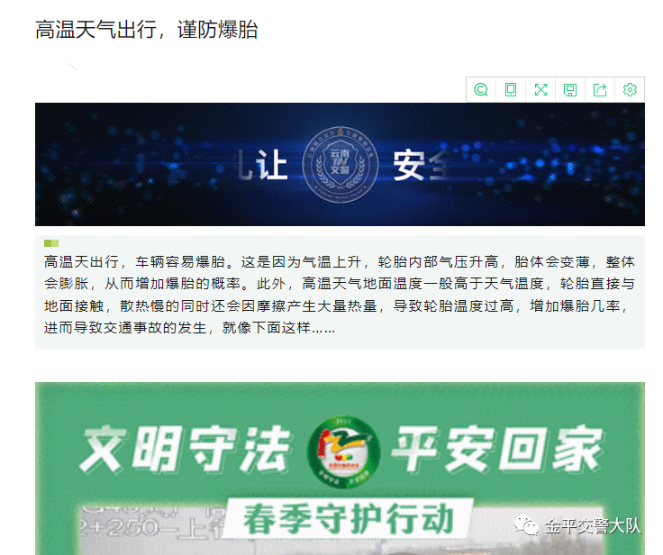 | 近期 夏日热浪席卷不断 高温天气持续不退 即便如此,我们的“焦”警蜀黍 依旧每天忙碌在各自的岗位上 接受着烈日的“烤”验  高温、闷热天气时间之长也给道路交通安全管理工作带来了严峻考验。为确保辖区道路交通安全形势平稳,金平县公安局交警大队顶着烈日持续开展道路交通事故预防隐患排查和严打整治专项行动,“四举措”战高温斗酷暑全力保安全保畅通。  战酷暑送清凉   为确保民警辅警在高温条件下,能保持饱满的精神状态和高涨的工作热情,大队切实从保障民警辅警身体健康的角度出发,加强关心关爱,强化后勤保障,给一线执勤民警辅警配发“警用冰袖”,以减轻烈日对身体的伤害。专属的“藏蓝色”冰袖,浓缩的是大队领导对高温下坚守岗位的民警辅警的关怀和厚爱。    排隐患保安全   对辖区事故多发路段和农村重点道路的道路交通安全隐患点开展深摸细排,重点排查临水临崖、交通标识、防护设施等道路交通安全隐患,工作中做到边排查边整改;对农村面包车、三轮车、摩托车、货车等逾期未检验、未报废的交通违法行为进行全面劝导,要求限期完成检验和报废工作,确保道路交通安全隐患动态“清零”。  管路面护畅通   针对夏季道路交通违法行为发生的特点,科学安排警力,强化路面巡逻管控,对“两客一危一货”、面包车、摩托车等重点车辆做到逢车必查,逢违必纠;重拳整治“三超一疲劳”、“一盔一带”、酒后驾驶等重点交通违法行为,确保辖区道路交通畅通。  广宣传提意识   利用微信公众号、交管12123、农村“大喇叭”等平台,开展道路交通安全知识宣传,曝光典型违法案例,警示群众提高交通安全意识,发布“高温”行车安全提示,进一步营造良好的道路交通环境。 自开展道路交通事故预防隐患排查和严打整治专项行动以来,共排查隐患100处,采取“应急三堵”56处;报废隐患车辆1038辆;共查处各类交通违法行为7501起;共发布交通安全提示短信1.2万余条,为我县夏季道路交通安全夯实了基础。 供稿:张成丽 文明驾驶,安全出行 |