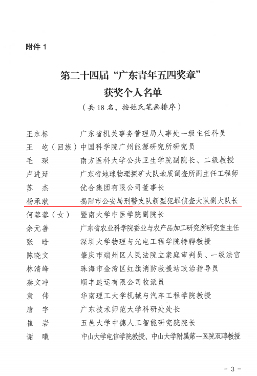 ![]() 第二十四届广东青年五四奖章 广东青年五四奖章是共青团广东省委员会、广东省青年联合会授予广东优秀青年的最高荣誉,旨在树立政治进步、品德高尚、贡献突出的优秀广东青年典型,反映当代广东青年的精神品格和价值追求。 在庆祝中国共产主义青年团成立100周年之际,为集中展示新时代广东青年的精神品格和价值追求,充分发挥青年典型模范带头作用,团结引领广大青年踔厉奋发、砥砺笃行,以优异成绩喜迎党的二十大胜利召开,4月28日,共青团广东省委员会、广东省青年联合会联合印发《关于颁授第二十四届“广东青年五四奖章”的决定》(以下简称“决定”),决定授予王永标等18名个人、广州中医药大学第二附属医院(广东省中医院)大德路总院骨伤一科等10个集体第二十四届“广东青年五四奖章”。 揭阳市公安局刑警支队新型犯罪侦查大队副大队长杨承耿获评第二十四届“广东青年五四奖章”! 揭阳空港经济区消防救援大队获评第二十四届“广东青年五四奖章”提名奖! ![]() 杨承耿 揭阳市公安局刑警支队新型犯罪侦查大队副大队长 杨承耿,男,汉族,1991年8月生,中共党员,在职研究生学历,现任揭阳市公安局刑警支队新型犯罪侦查大队副大队长。他善于运用大数据进行分析研判、侦查破案,主侦的网络传销案被公安部誉为“全链条、整规模打击虚拟货币传销犯罪的经典战役”;他参与侦办多宗涉黑专案,处置涉案资产超18亿元;他发起全国首宗“猫池”犯罪集群战役,为“断卡”行动做出突出贡献。先后荣获全国优秀人民警察、广东省优秀共产党员等荣誉称号。 ![]() 揭阳空港经济区消防救援大队 揭阳空港经济区消防救援大队成立于2003年8月,历年来,抢救被困人员近400名,抢救财产价值5.39亿元,灭火抢险救援成功率100%,同时实现执法工作“零信访、零投诉”。打造的“一抖一快两微三端四号”消防新媒体宣传矩阵,全网粉丝超650万,作品点赞量超过2亿次,播放量超过30亿次,连续3年蝉联全国消防系统政务号十强,队伍及拍摄作品先后40余次登陆中央电视台、人民日报等主流媒体,多次获得国家级、省部级表彰。 ![]() ![]() ![]() 来源:广东共青团 更多精彩内容 关注【揭阳共青团】 ![]() |