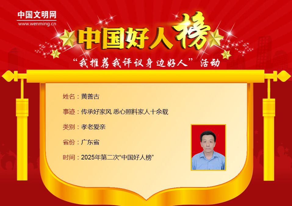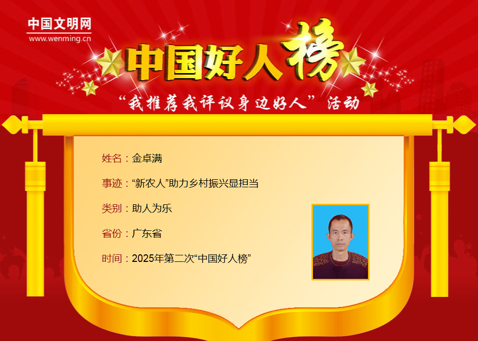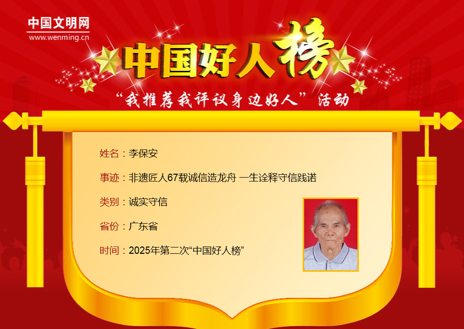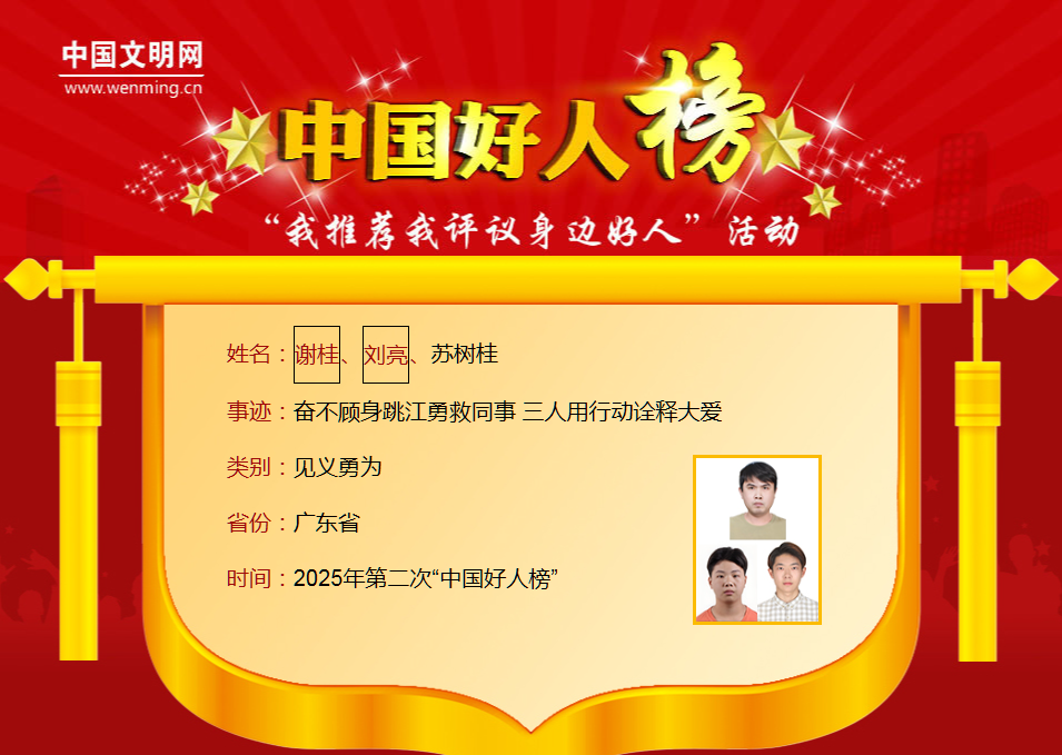 ![]() 8月27日,2025年第二次“中国好人榜”发布仪式暨全国道德模范与身边好人现场交流活动在黑龙江省伊春市举办。广东共有6人(组)光荣上榜,分别是:黄烁榕、金卓满、刘选仁、谢桂、刘亮、苏树桂、李保安、黄善古。 其中,汕头市澄海区金佳顺生态种养专业合作社理事长金卓满获评助人为乐类“中国好人”。 ![]() ![]() 让我们一起来 了解他们的先进事迹吧 ↓↓↓ ![]() 黄烁榕与病魔搏斗三十余载 热心公益帮助万千病友 ![]() 黄烁榕,女,1980年7月生,中共党员,广东省惠州市惠东县平山街道湖榕社区党委副书记。 黄烁榕年幼时不幸患上癫痫,但她以顽强意志面对生活的各种磨难和考验,鼓舞病友乐观面对疾病、重拾人生自信,用自己的经历为病友照亮前行的道路。黄烁榕曾获“广东好人”、广东省岗位学雷锋标兵等荣誉。 ![]() 金卓满“新农人”助力乡村振兴显担当 ![]() 金卓满,男,1978年2月生,中共党员,广东省汕头市澄海区金佳顺生态种养专业合作社理事长。 从帮助农户解决滞销难题到带动农户增收致富,从扶持退役军人创业到助力困难群体增收,他将军人“不抛弃、不放弃”的信念融入乡村振兴事业,用实际行动践行助人为乐的初心。金卓满曾获全国劳动模范、全国农业农村劳动模范、“广东好人”、广东省岗位学雷锋标兵等荣誉。 ![]() 刘选仁花甲老人20载献爱心 为无数家庭送去温暖 ![]() 刘选仁,男,1957年5月生,广东省梅州市兴宁市叶塘镇麻岭村村民。 刘选仁2005年返乡后开始资助困难学子。他走访山区家庭,为困难孩子送去书包和助学金;他发起成立兴宁市善小助学协会,资助大学生、救助重病学子、修缮危房;他成立“让爱回家应急寻人服务队”,帮助寻回走失人员。2023年患癌后,他仍坚持志愿服务,激励更多人投身公益。刘选仁曾获全国敬老爱老助老模范人物、“广东好人”、广东省岗位学雷锋标兵、广东省最美志愿者等荣誉。 ![]() 谢桂、刘亮、苏树桂奋不顾身跳江勇救同事 三人用行动诠释大爱 ![]() 谢桂,男,1992年7月生,中共党员,生前系广东省潮州市某传媒有限公司员工。刘亮,男,2006年4月生,生前系广东省潮州市某传媒有限公司员工。苏树桂,男,2002年1月生,广东省潮州市某传媒有限公司员工。 2025年3月5日清晨,当人们还沉睡中,广东潮州韩江边一场悲剧骤然发生。谢桂、刘亮、苏树桂在面对同事即将轻生的关键时刻作出了相同的选择——跃入寒冷的水中实施营救,最终轻生者获救,而谢桂、刘亮却不幸牺牲。 ![]() 李保安非遗匠人67载诚信造龙舟 一生诠释守信践诺 ![]() 李保安,男,1936年6月生,广东省佛山市三水李保安龙舟厂创始人。 从手工打造第一艘传统龙舟起,67年来,李保安始终坚持以诚立业、守信经营、诚信传家,严把龙舟制作细节质量。他常说:“宁愿少做十条,也不做差一条”。他用坚守和创新,让“三水李保安造”成为龙舟制造的“金字招牌”。李保安曾获全国诚信之星、“广东好人”等荣誉。 ![]() 黄善古传承好家风 悉心照料家人十余载 ![]() 黄善古,男,1962年6月生,中共党员,广东省韶关市翁源县龙仙镇康乐社区居民。 黄善古的女儿1岁时被确诊为罕见的特发性心肌扩张症,他和妻子日夜守护,四处寻医问药,女儿最终康复,如今已成家立业。2010年起,他悉心照料患帕金森综合征的岳母15年;母亲直肠癌复发后,他病床前伺候100多天;岳父中风瘫痪,他照顾3年多;父亲患肺病,他呵护至老人离世,用实际行动诠释了亲情与责任的真谛。黄善古曾获“广东好人”等荣誉。 2025年第二次“中国好人榜”榜单 ![]() 点击阅读原文查看详细事迹 让我们传递榜样力量 为凡而不凡的“中国好人” 点赞!! ![]() 编辑:许钊达 校对:翁夏 审核:陈群 来源:汕头发布 ![]() |