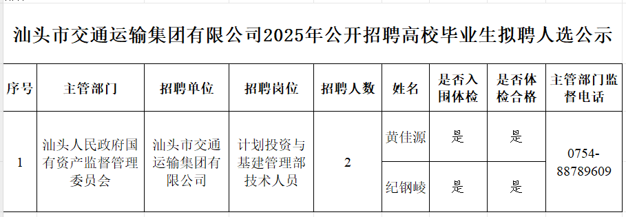 招 聘 公 示 根据《汕头市交通运输集团有限公司2025年公开招聘高校毕业生公告》有关规定和要求,经面试、体检合格,现将汕头市交通运输集团有限公司2025年公开招聘高校毕业生拟聘人选名单予以公示(见附件)。公示期间,如对拟聘人选有异议,可通过来信、来电、来访等形式向我们反映。 公示时间:2025年10月20日至10月24日(5个工作日) 受理单位:汕头市交通运输集团有限公司 受理电话:0754-82909877 主管部门:汕头人民政府国有资产监督管理委员会 监督电话:0754-88789609 通信地址:汕头市金平区潮汕路4号9楼人力资源部 邮政编码:515011 附件:汕头市交通运输集团有限公司2025年公开招聘高校毕业生拟聘人选名单 汕头市交通运输集团有限公司 2025年10月17日 ![]() END 版权为汕头市交通运输集团有限公司所有 未经允许不得转载 文字:集团人力资源部 编审:集团办公室 共创·共赢·共享 ![]() |