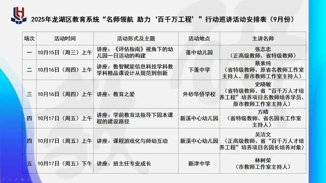 ![]() 为深入贯彻落实“百千万工程”教育高质量发展要求,提升龙湖区教师队伍专业素养,2025年10月15日至17日,由龙湖区教师发展中心主办的“名师领航 助力‘百千万工程’”9月巡讲活动顺利举行。本次活动原定于9月举办,因受台风“桦加沙”影响延期至10月,在各教育集团、中小学及幼儿园的积极配合下,圆满完成各项巡讲任务。 ![]() ![]() ![]() ![]() ![]() ![]() 本次巡讲活动共设五个专场,覆盖幼儿园、中小学多个学段和学科领域,邀请区内6位名师担任主讲,内容紧扣教育前沿与教学实践,为广大教师提供了宝贵的学习交流平台。 专场一:幼儿园一日活动的构建 10月15日上午,蓬中幼儿园迎来了首场讲座。主讲名师张志忠从《评估指南》视角出发,深入探讨幼儿园一日活动的科学构建,为来自鸥汀、龙祥、外砂、龙华、新溪、新海街道的幼儿园骨干教师带来启发与思考。随后,三位教师代表上台,结合自身实践分享了学习体会与宝贵经验。 专场二:数智赋能信息科技教学 10月16日上午,在下蓬中学举行的信息科技专场中,蔡素纯老师以“数智赋能”为主题,分享信息技术与学科融合的创新路径,吸引了全区中小学信息技术教师及中心组成员的积极参与。 专场三:教育之爱——青年教师成长之路 同日上午,外砂华侨学校迎来了史晓敏老师的专题讲座“教育之爱”,聚焦青年教师的专业成长与情感培育,激励在场教师以爱育人、以情执教。 专场四:园本课程建设与课堂互动 10月17日上午,在新溪中心幼儿园专场中,有两位名师开讲。方晴园长“学前教育法指导下的园本课程建设路径”的讲座,为外砂、龙华、新溪、新海街道的幼儿园骨干教师及新入职教师指明发展方向。 吴洁文书记的“课程游戏化与师幼互动”专题讲座,聚焦幼儿教育与课堂互动策略,为参加活动教师提供了实用的教学参考。 专场五:班主任专业成长策略 10月17日上午,在新津中学的班主任专场中,主讲名师林树荣以《追光而遇、沐光而行,心向成光》为题开讲,深入浅出解读班主任核心能力,为青年班主任教师送上“带班锦囊”。 ![]() 本次活动不仅为龙湖区教师提供了专业发展的契机,也进一步推动了区域教育资源的共享与优化。各专场组织有序,教师参与积极,现场互动热烈,取得了良好的培训效果。龙湖区教师发展中心将继续依托“名师领航”平台,持续开展系列教研活动,助力龙湖教育高质量发展,为“百千万工程”贡献教育力量。 ![]() 来源:龙湖区教师发展中心 校对:李光耀 审核:陈铮淮 ![]() ![]() |