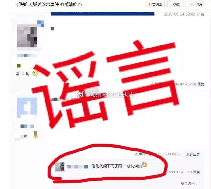8月14日凌晨,德清县乾元镇直街余不弄口发生一起故意伤害案件,嫌疑人被已被当场抓获,受害人被及时送往医院。当日上午,网民王某聪(男,24岁,乾元镇人)为博取他人关注,在“百度贴吧”内称“刚刚我问了下死了两个,感情纠纷”。