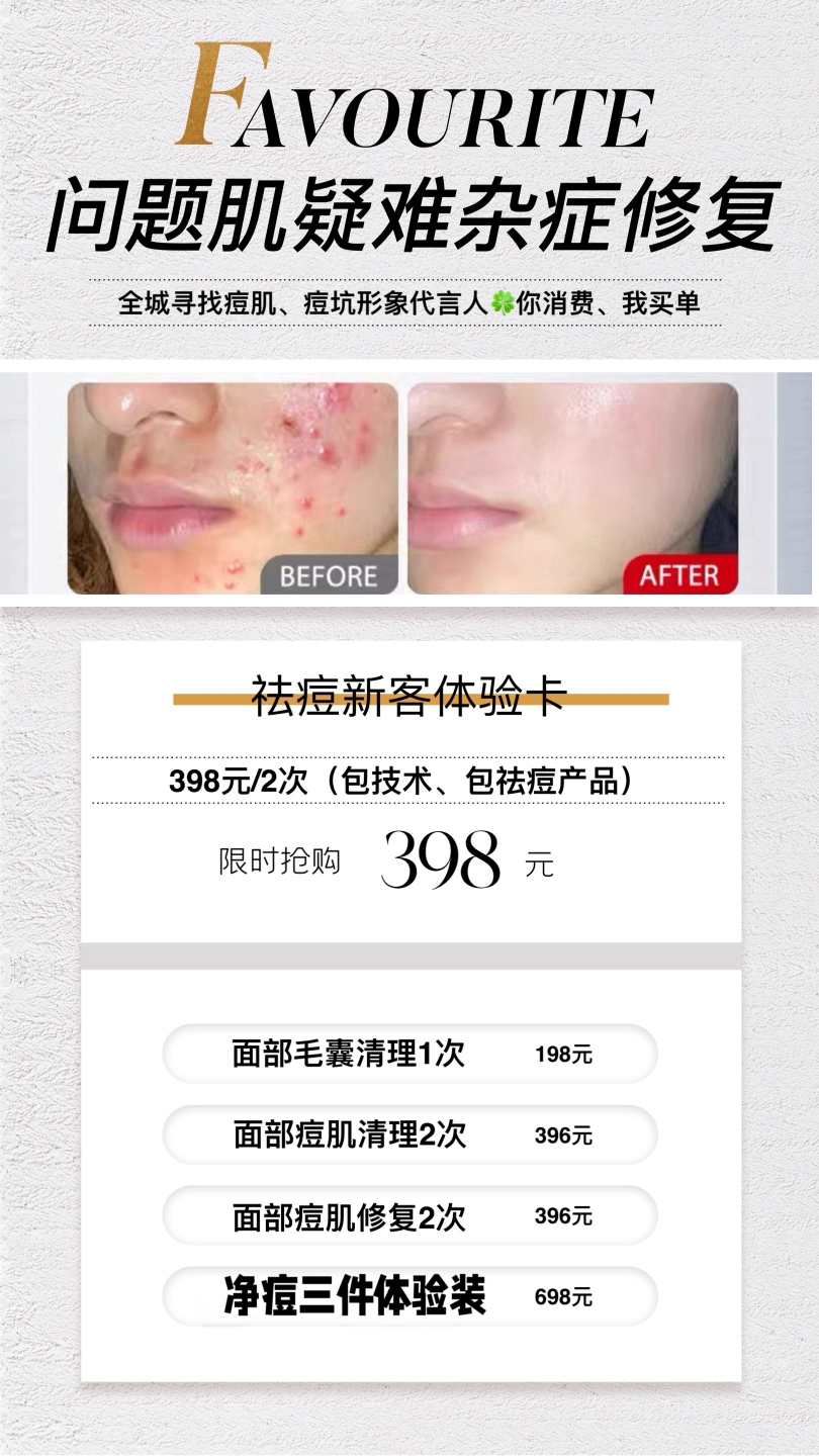 汕头市区一家美容工作室一、养护项目一律首次免费体验,仅限女宾‼️开卡998/10送3次,单次付费90。(手工艾灸、刮痧啥啥的全包在里面了,不会再另收费无套路。ps:套路好累啊,生活不容易,大家来放松身心,我赚几个小钱钱,咱都轻松点不要费脑☺。)二、问题肌项目有祛痘体验卡、痘坑体验卡祛痘体验卡398元/2次 (包含祛痘家居三件套体验装)痘坑修复体验卡598/1次附带2支修复液(具体看痘坑数量多少来决定首次体验要修复几个痘坑)无隐形消费、无强制消费,只有默默做护理店家一枚。‼️养护项目仅限女宾问题肌修复可视情况接待男宾。
